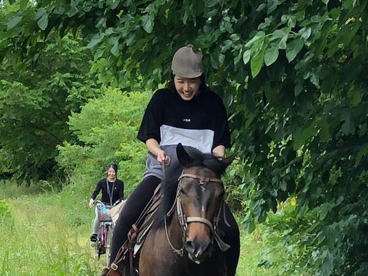 お二人で参加のお客さまは、馬と一緒にサイクリングを楽しみながら交代でのトレッキングになります。